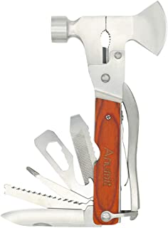 - Stainless steel with hammer, axe knife, bottle opener, screwdriver, pliers, fish descaler, saw, file, scale knife, rasp, wire cutter, assorted hex wrenches and more with a safety lock