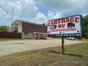 We stayed at Carthage RV Campground during August of 2020. The staff were super friendly and helpful. Nice, really large spots with full concrete pads. Clean bathroom and shower, and nice common room with games and some exercise equipment. The spot we stayed in was plenty long and wide enough for our 36’ fifth-wheel trailer, truck, and car towed behind. We were about half way back in the park and only heard a little highway noise; not nearly loud enough to be a problem. This park will be on our list of places to stop again when we pass through the area.